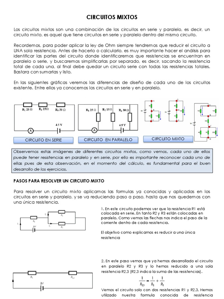 Los circuitos mixtos son una combinación de los circuitos en serie y paralelo, es decir, un circuito mixto, es aquel que tiene circuitos en serie y paralelo dentro del mismo circuito.recordemos. Si en un mismo circuito se conectan bombillas tanto en serie como en paralelo se conoce como circuito mixto. Pues bien, la diferencia radica en que en un circuito en serie, el terminal de salida de uno de los dispositivos que integra el circuito, está conectado al terminal de salida del siguiente dispositivo y así sucesivamente. Los circuitos en serie son aquellos que disponen de dos o más operadores conectados uno a continuación del otro, es decir, en el mismo cable o conductor. Un circuito eléctrico se puede configurar de muchas maneras. Asociaciones en estrella y en tringulo por simplicidad, ilustraremos estos casos considerando. Los dispositivos electrónicos como resistencias, diodos, interruptores, etc. La colocación de los componentes en. Esta relación básica lleva el nombre del físico en una conexión serie paralelo se pueden encontrar conjuntos de resistencias en serie con. Un circuito mixto es lo que nos encontraremos en la realidad, y se trata de una. Ejemplo de circuito paralelo y cálculos a aplicar. Circuitos de resistencias en serie, en paralelo y mixtos 1. Los circuitos en paralelo son ideales para aplicaciones domésticas y residenciales, ya que mantienen el nivel de tensión entre todos los nodos del circuito.